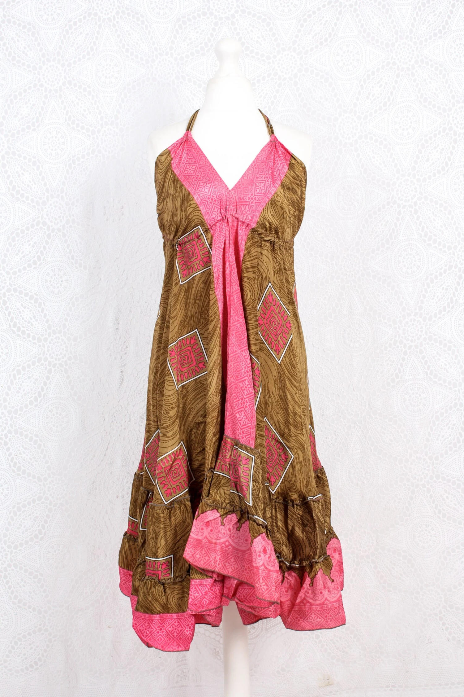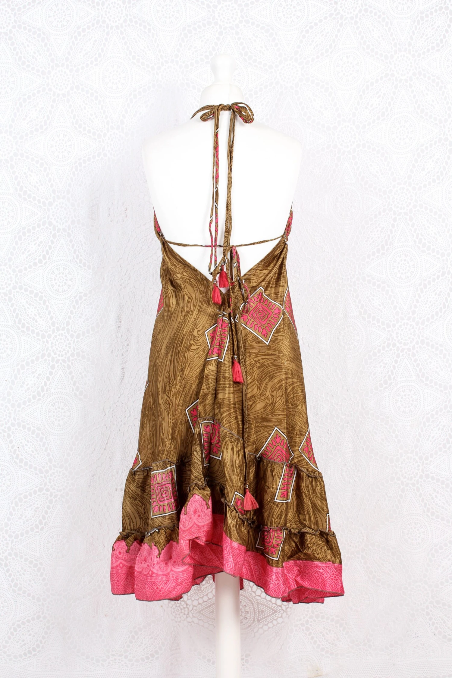 Stunning halter-neck mini dress, re-made from vintage recycled Indian fabrics. Super soft silky material with a frill tiered skirt. Tassels at the neck and as a drawstring waist to adjust the size. Falls just above or below the knee depending on your height.
