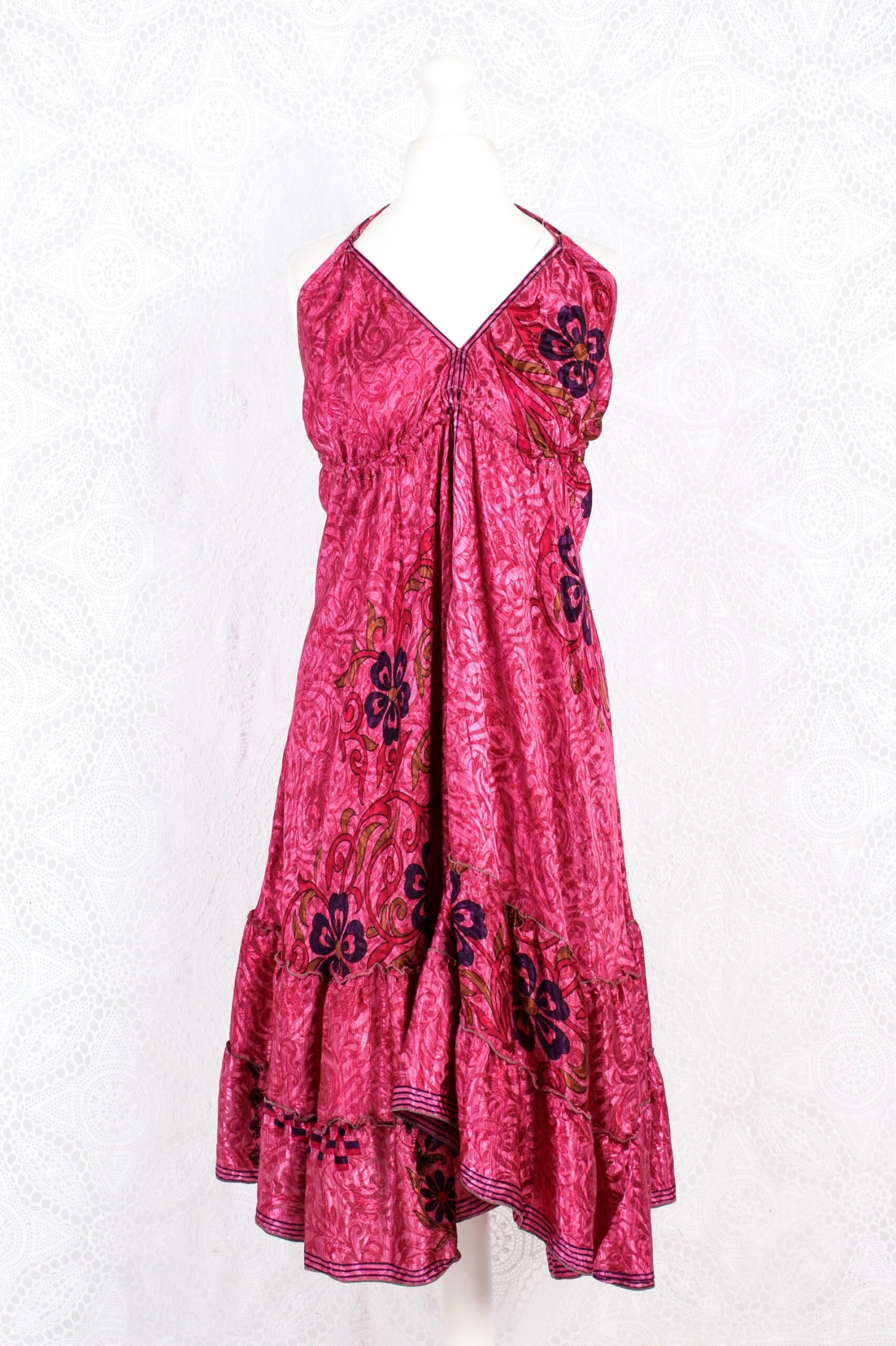 Stunning halter-neck mini dress, re-made from vintage recycled Indian fabrics. Super soft silky material with a frill tiered skirt. Tassels at the neck and as a drawstring waist to adjust the size. Falls just above or below the knee depending on your height.