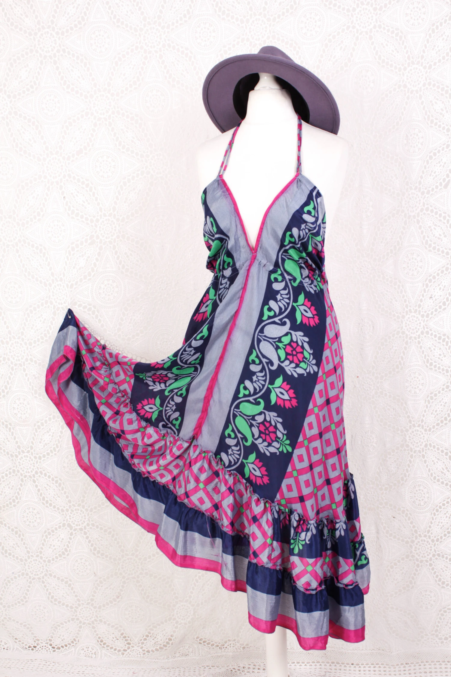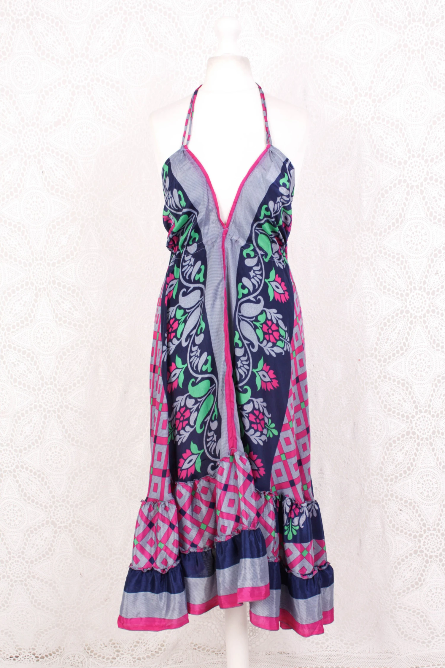 Blossom Mini Halter Dress – Vintage Indian Sari – Moonlight, Inky Blue & Pink Graphic – XL