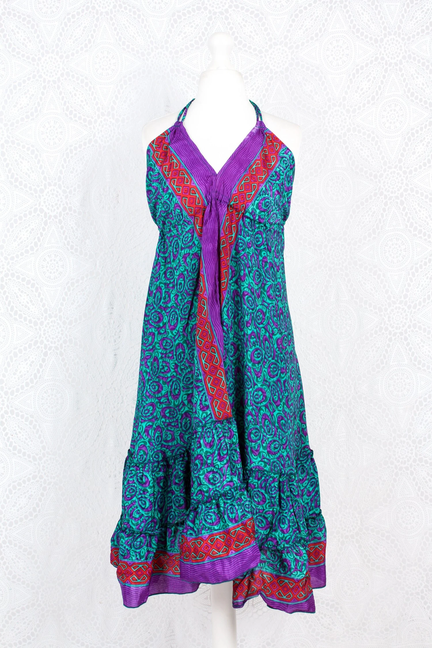Stunning halter-neck mini dress, re-made from vintage recycled Indian fabrics. Super soft silky material with a frill tiered skirt. Tassels at the neck and as a drawstring waist to adjust the size. Falls just above or below the knee depending on your height.