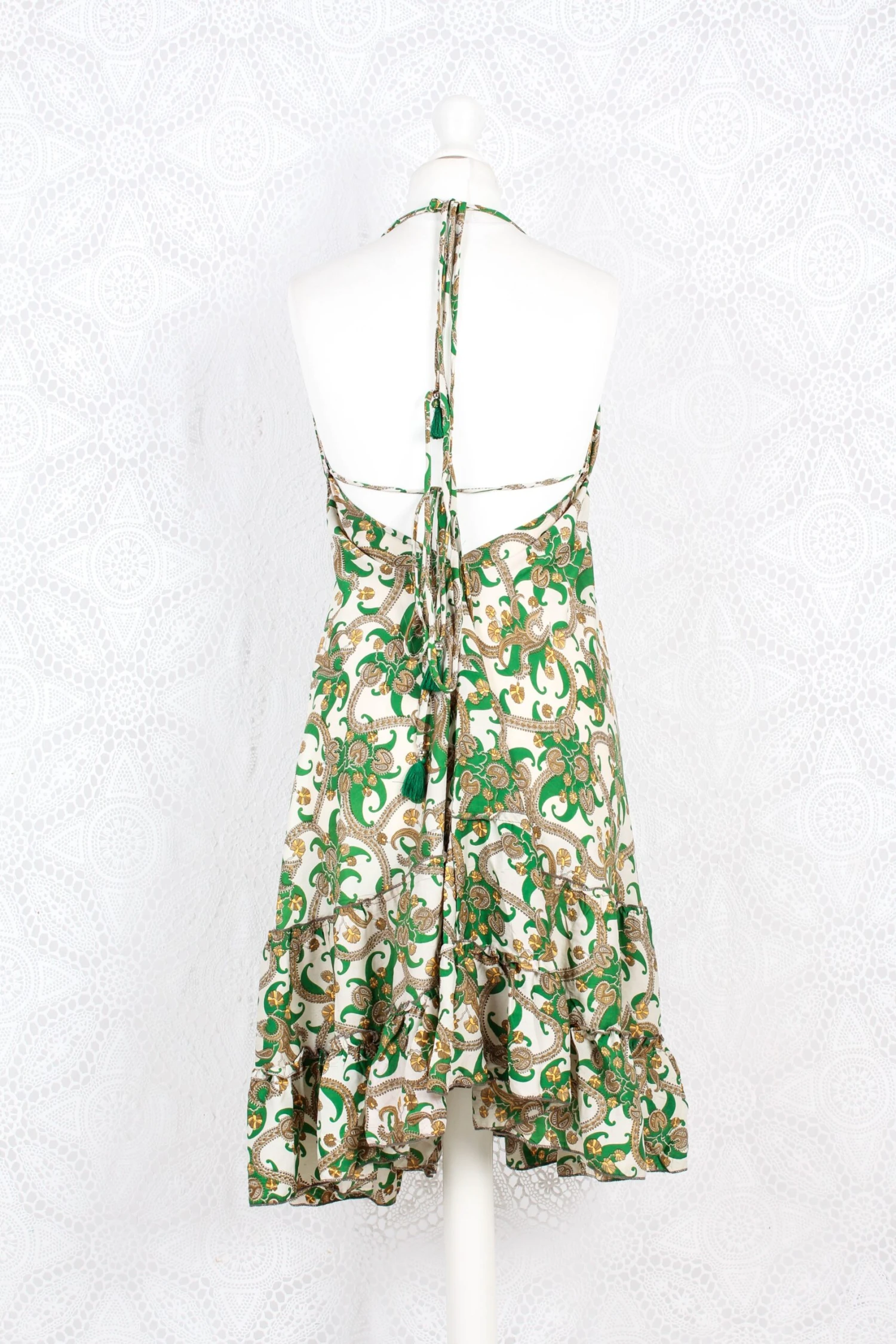 Stunning halter-neck mini dress, re-made from vintage recycled Indian fabrics. Super soft silky material with a frill tiered skirt. Tassels at the neck and as a drawstring waist to adjust the size. Falls just above or below the knee depending on your height.