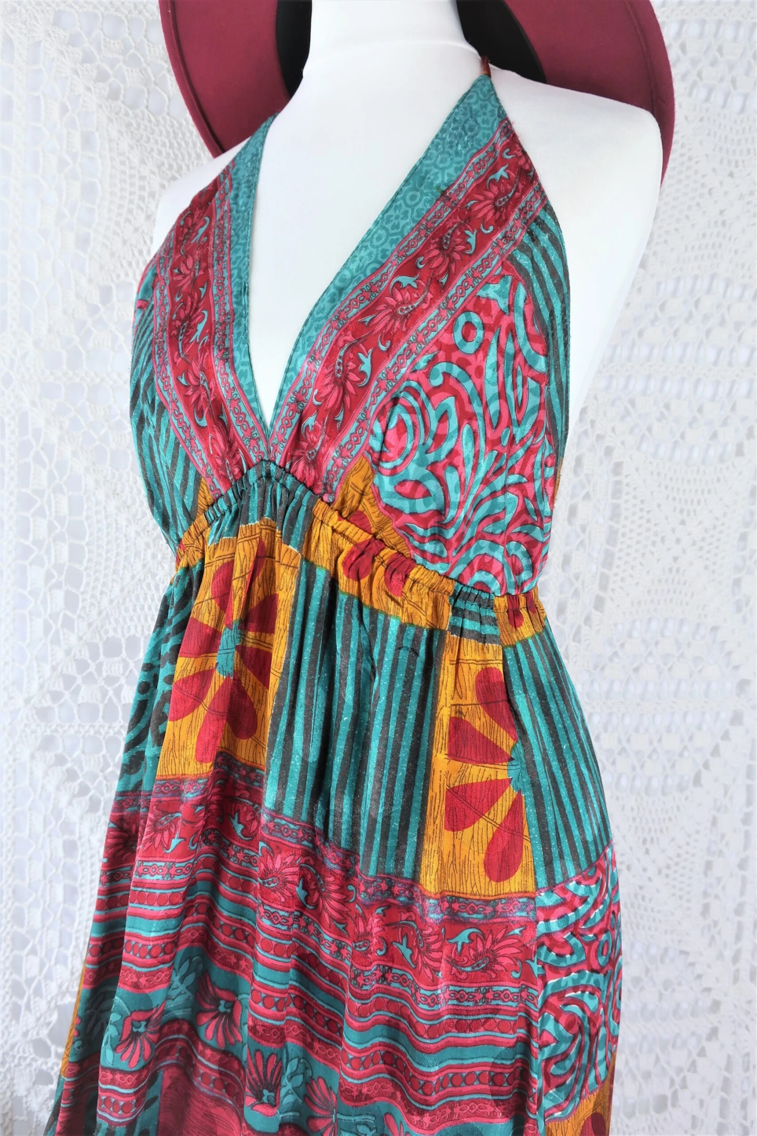 Made from vintage recycled Indian fabrics. Super soft silky material with a gorgeous colour and print. It has adjustable ribbon ties at the neck and waist to fit you perfectly.