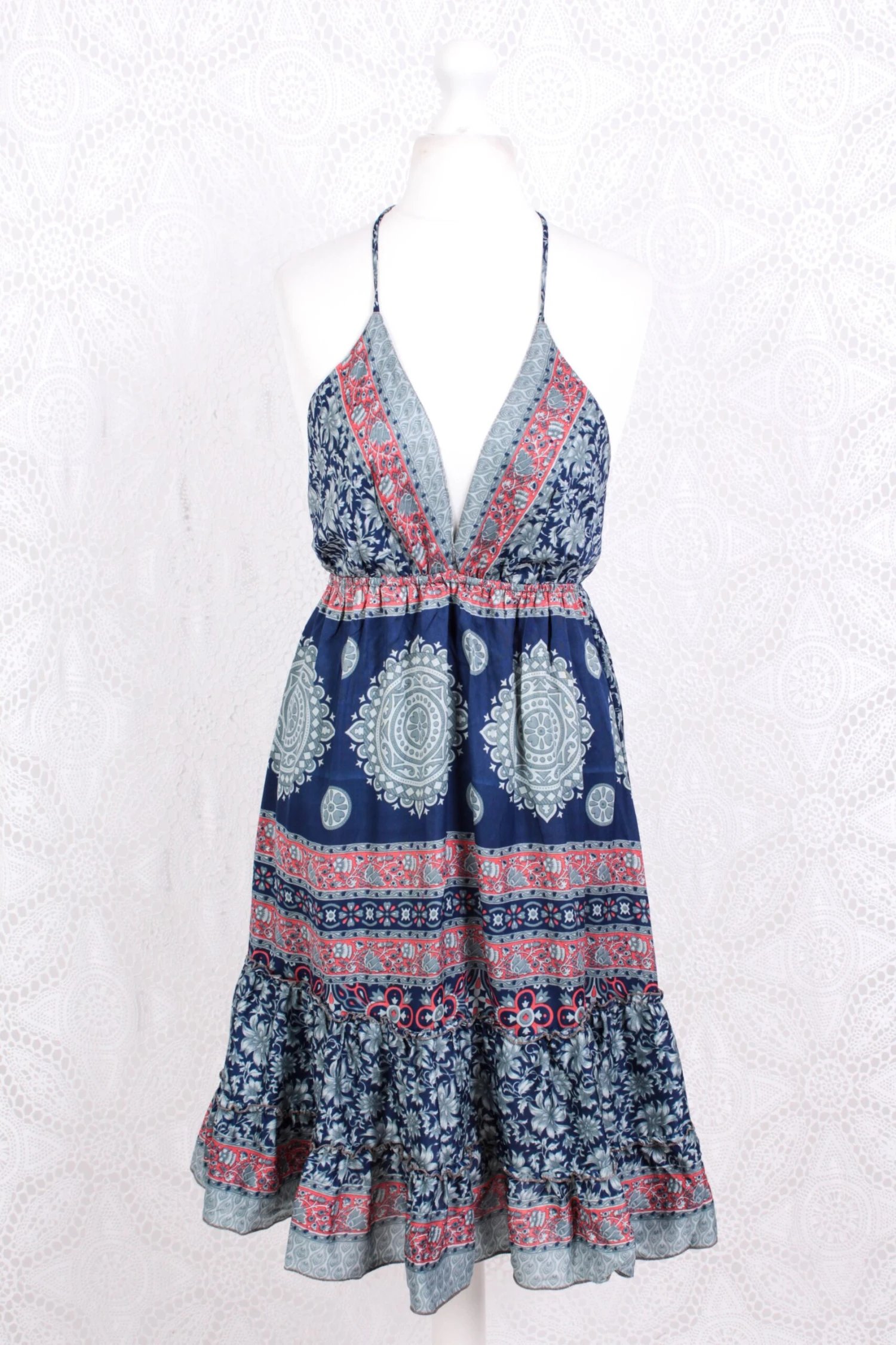 Stunning halter-neck mini dress, re-made from vintage recycled Indian fabrics. Super soft silky material with a gorgeous colour and print. Tassels at the neck and has a drawstring waist to adjust the size.