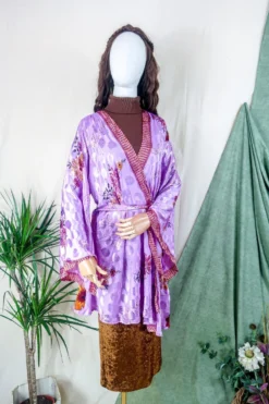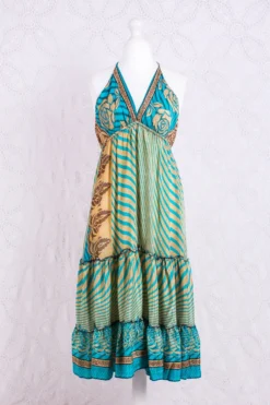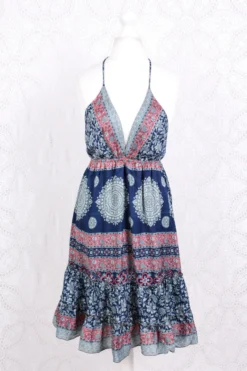 Cherry Mini Halter Dress – Oat & Pink Floral Vintage Sari (Free Size)
