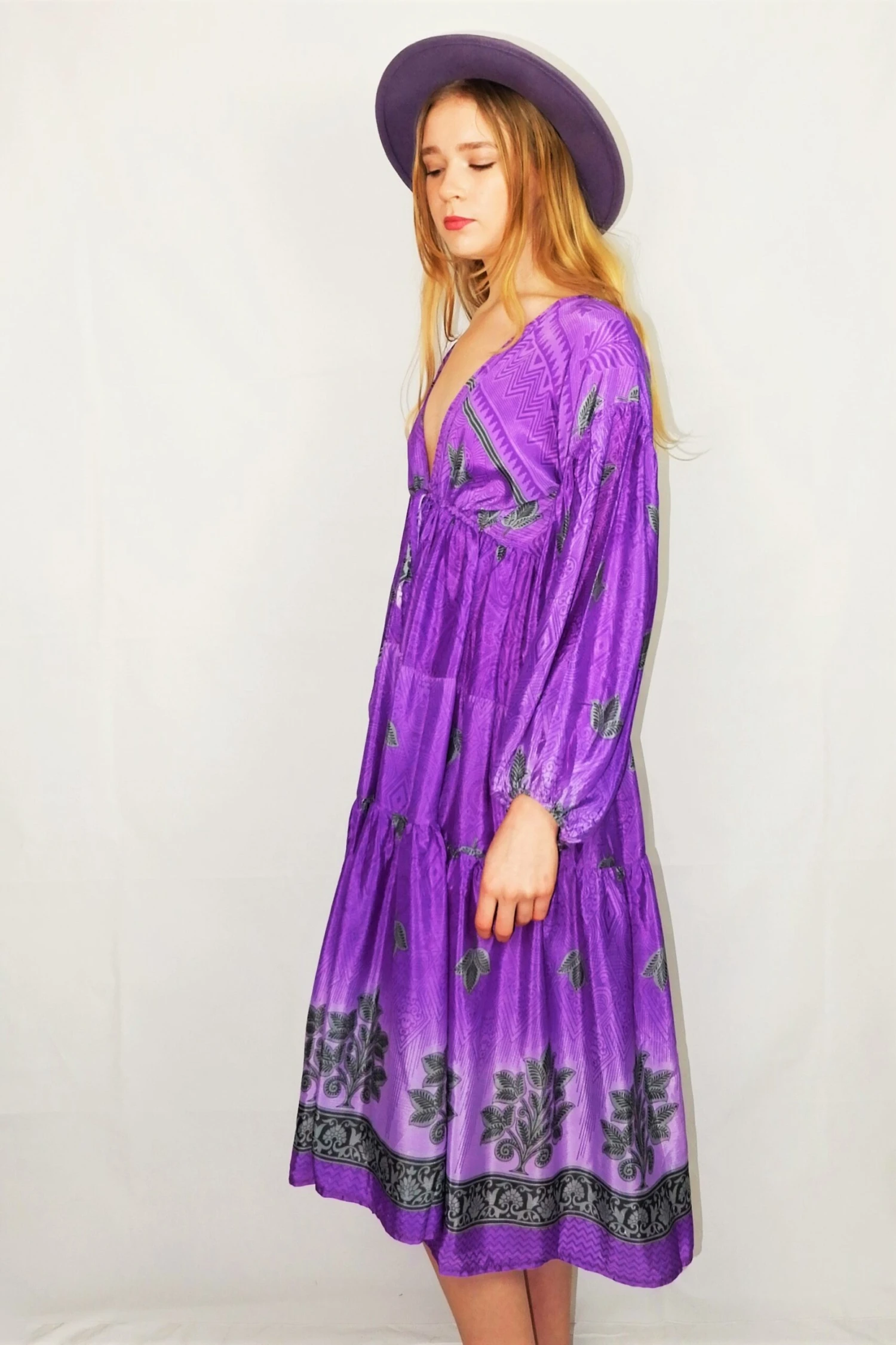 Really flattering shape and amazing print, has balloon shaped sleeves and adjustable underbust ribbon tie. Can be worn loose and flowing or more fitted by using the waist ties, or adding a cinching waist belt. Very low cut bust line so you may wish to wear a cami, slip or bandeau with the deep V neckline.