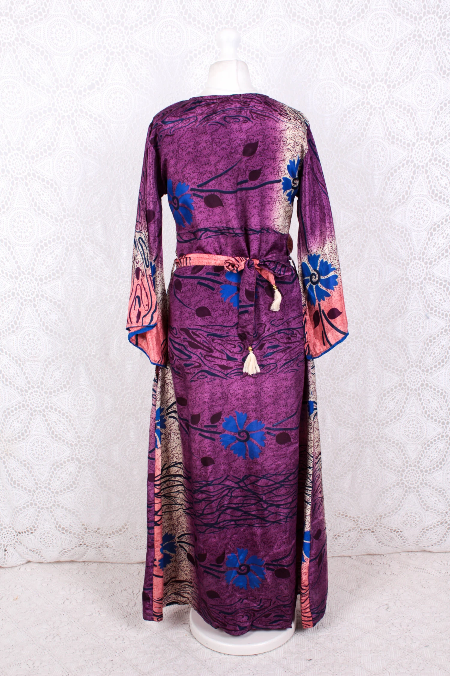 Jasmine Maxi Dress – Plum, Salmon & Azure Floral Ripple Vintage Sari – Size S/M