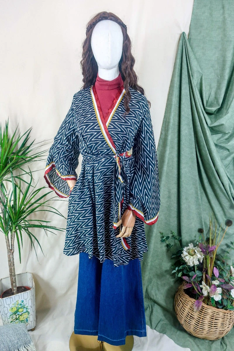 With long retro floaty wide sleeves, a belt and wrap ties inside to adjust to your shape, alternatively use the belt loops with a vintage belt for a more retro look. It’s super flattering to wear as a cute mini dress or easy to style and layer over flares and light knitwear! Also has handy pockets!