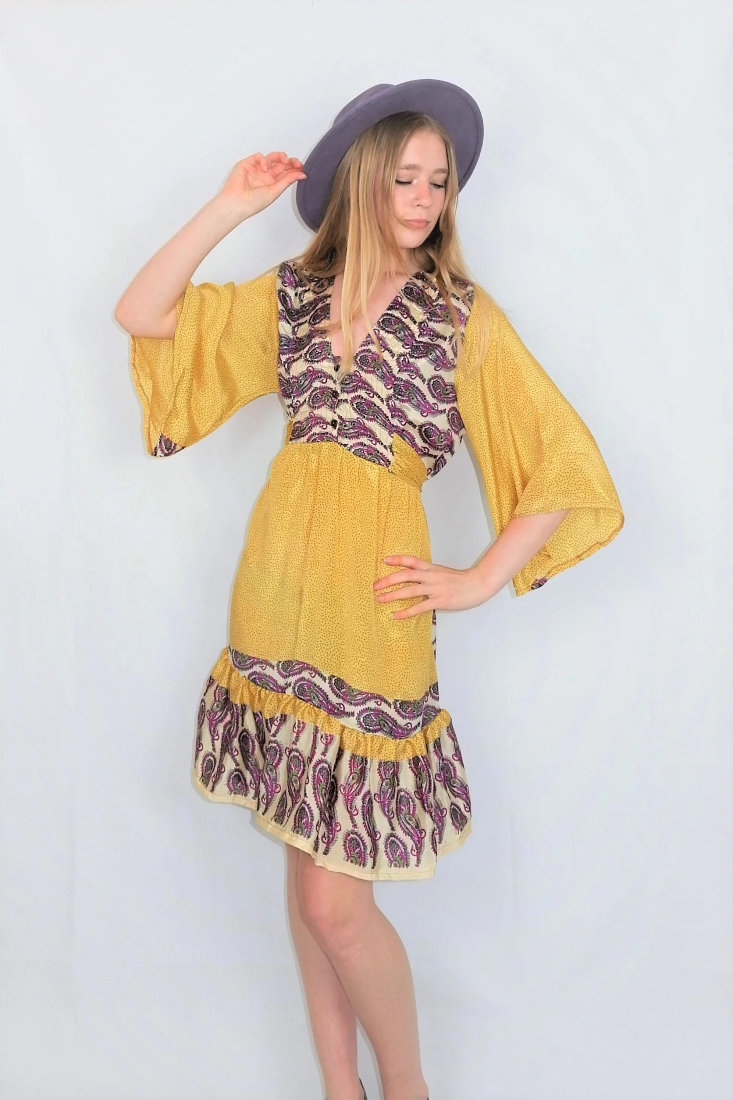 Upcycled from vintage Indian sari fabric. Really flattering shape and amazing print, has wide half sleeves and adjustable under-bust waist ties, so it can fit you perfectly, or be left open and floaty. Feels like a silky/poly blend.