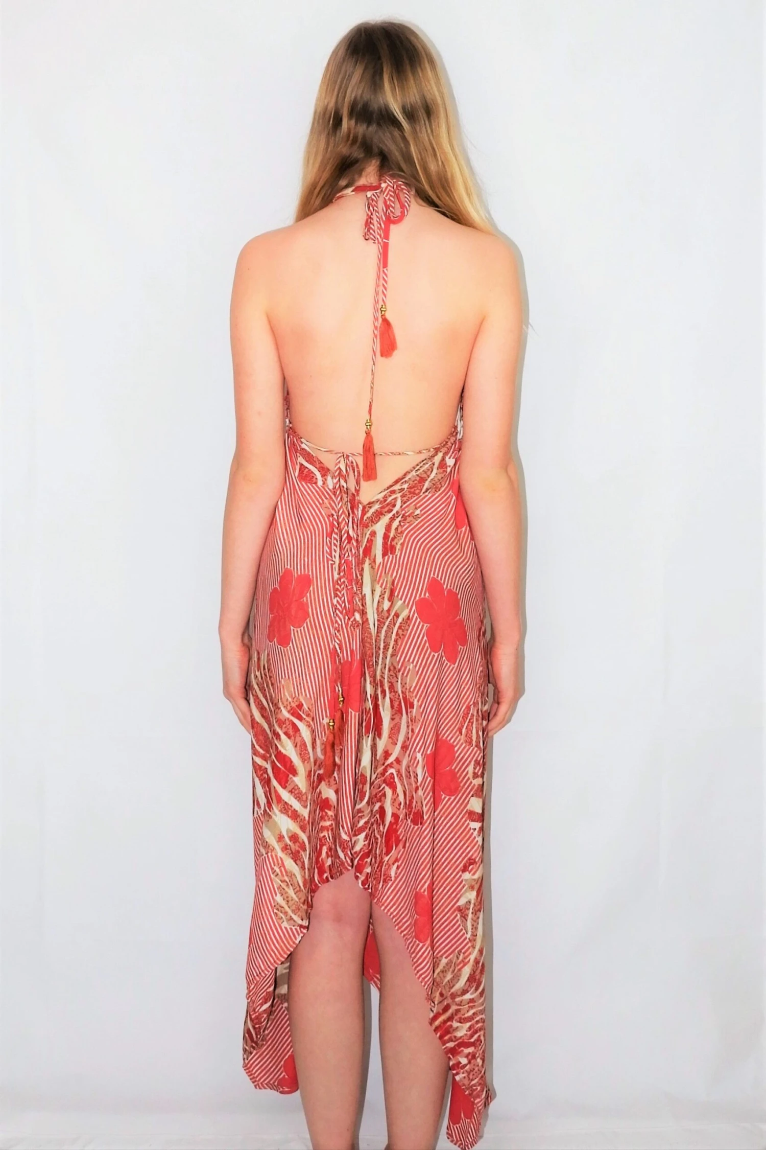 Stunning halter-neck midi/maxi dress with a dramatic asymmetrical hem the gives it an amazing & flattering shape. Tassels at the neck and a drawstring waist means that this style can be adjusted for multiple sizes.