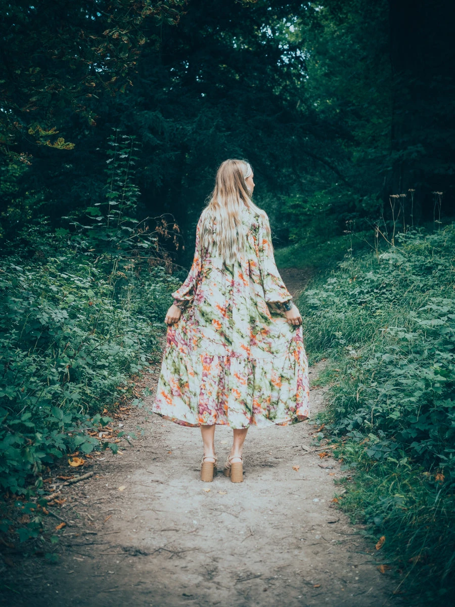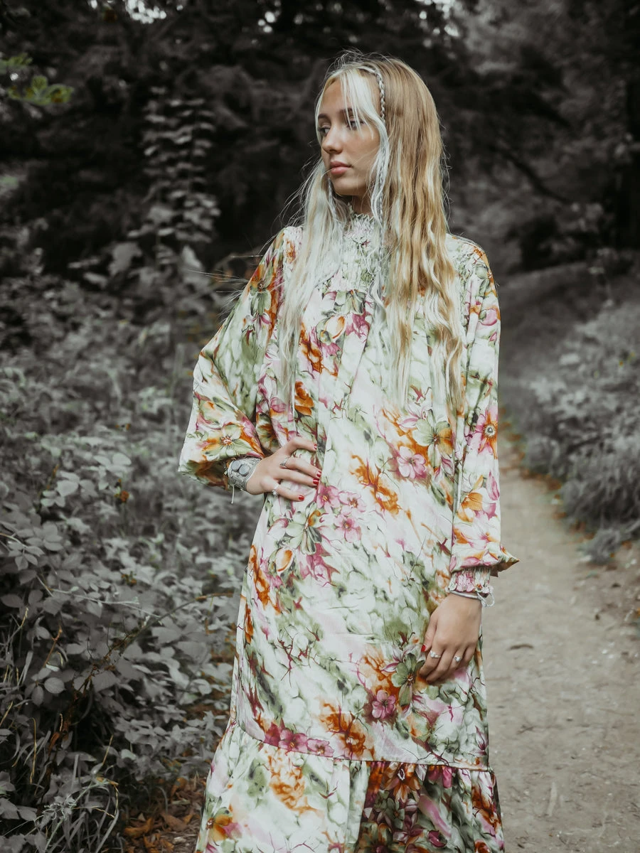 Really high neckline, with ruched bust panel and back, long balloon sleeves that gather at the cuffs. It is a long midi length dress with with a lovely frill hem.