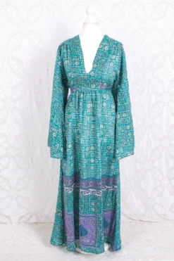Rosemary Maxi Dress – Vintage Indian Sari – Emerald & Magenta Peacock Illustrations – XS/S