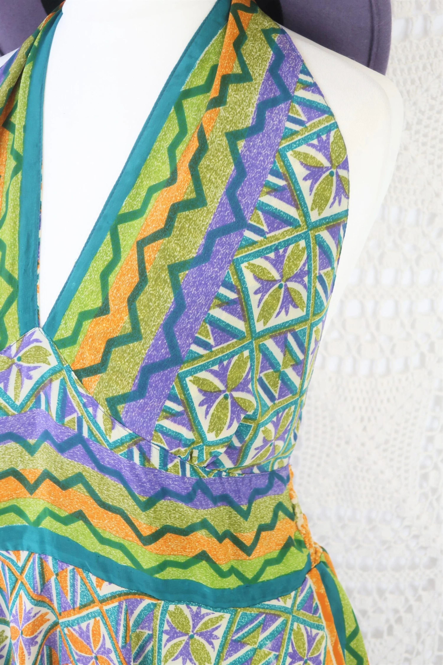 Stunning 70s boho inspired mini dress, made from vintage recycled Indian fabrics so each one is truly unique! Super soft silky sari material with a gorgeous colour and print.