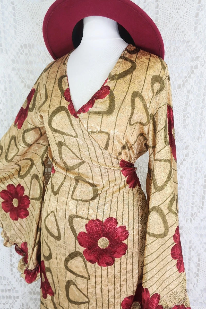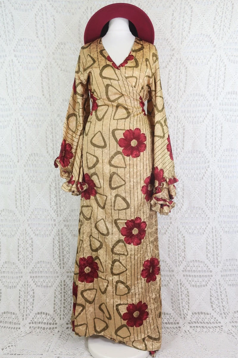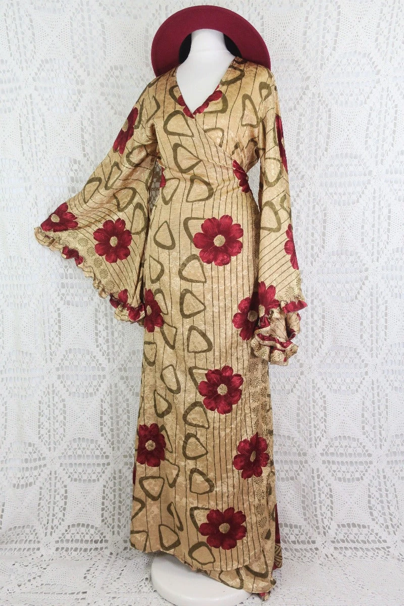 This fabulous wrap dress features a fitted tie-waist body with v-neckline and our famous exaggerated bell sleeves, finished with frilled cuffs. Handmade in lightweight recycled vintage fabrics, This dress looks wonderful accessorised with our boho jewellery and styled for a stunning & super glamorous outfit!