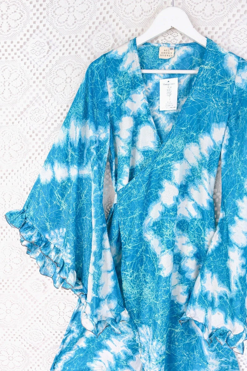 This luxurious handmade midi length wrap dress is inspired by dreamy 70s bohemia, with exaggerated frilly butterfly bell sleeves. Designed with every season in mind; wear her on her own as a dress, or style as a tunic top over a pair of vintage flares.